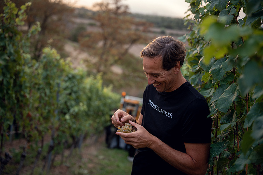 In diesem Jahr begann die Lese unerwartet früh – und so machte sich das gesamte Dreissigacker-Team, auf den Weg in die Weinberge.