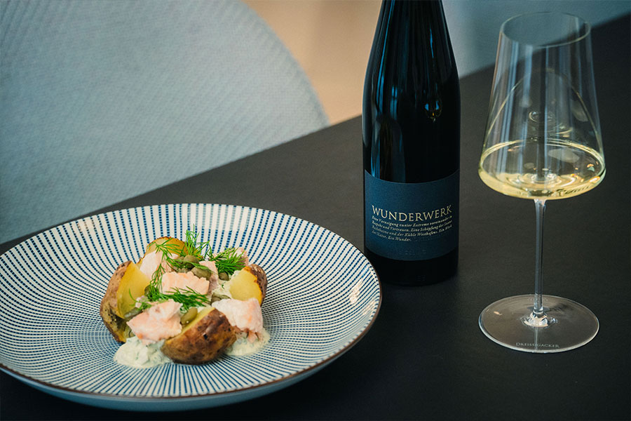 Warme Ofenkartoffel, knusprige Schale, weiches Inneres. Dazu Lachs, Kapern und eine frische Kräutercreme, die alles verbindet. Salzig, cremig, klar.