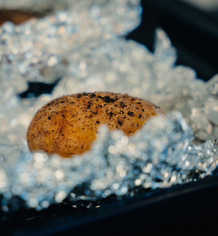 Ofen auf 230 °C vorheizen. Kartoffeln mit Olivenöl, Salz und Pfeffer einreiben, mehrfach einstechen, in Alufolie wickeln und etwa 1 Stunde 15 Minuten backen. Für die letzten 15 Minuten die Folie entfernen, damit die Schale knusprig wird.