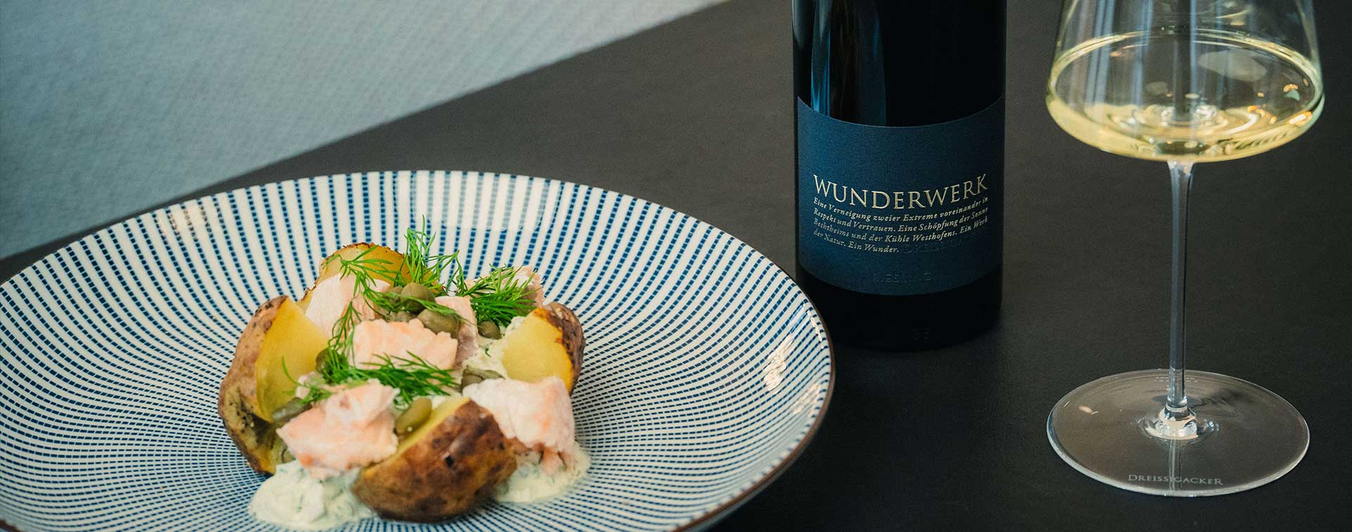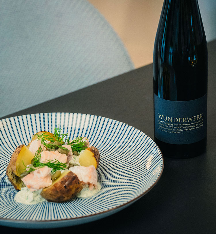 Warme Ofenkartoffel, knusprige Schale, weiches Inneres. Dazu Lachs, Kapern und eine frische Kräutercreme, die alles verbindet. Salzig, cremig, klar. Mehr braucht es nicht. Der Wunderwerk Riesling begleitet mit präziser Struktur: Seine Säure trägt die Cremigkeit, hebt die Zitrusnoten hervor und bringt Spannung in jede Komponente. Ein großartiges Zusammenspiel.